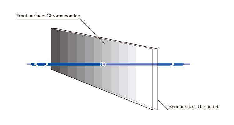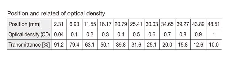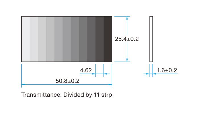 阶梯变化中性滤光片的主要材质是青板玻璃,透过率为10~91.2%(划分为11阶梯) ,通过光学密度的等间距变化,可以调节透过光量,由于是镀铬膜,在可见光区域光学密度不会随波长的变化而变化,而且,它不仅可以用于浓度计或测色计的校准,还可以用于低功率的激光光束的光量调节。
