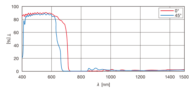 ▶相对滤光片倾斜射入光线时,可见光的长波长一侧的透过率会下降。