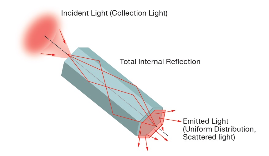 ▶侧面是全反射面。如果侧面有指纹或脏物时,其反射率和出射光强的均匀度都会变差。