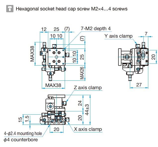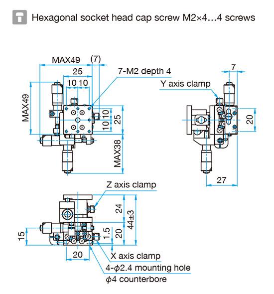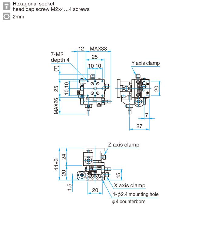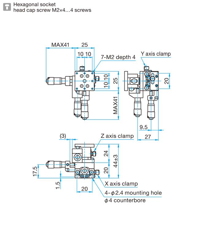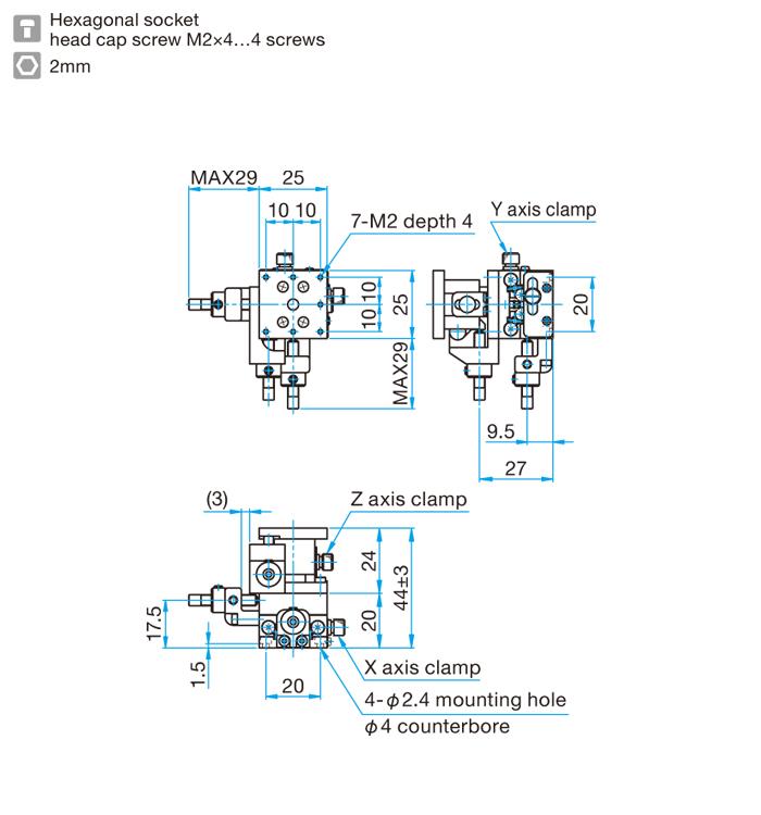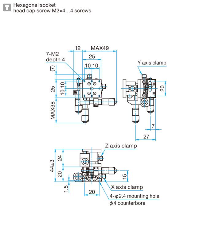 4.型号末尾为FP的产品,采用的是精密调整螺杆,请注意不是一般的微分头。精密调整螺杆的螺距为0.25mm,在操作时请使用六角扳手或另售的六角手轮扳手